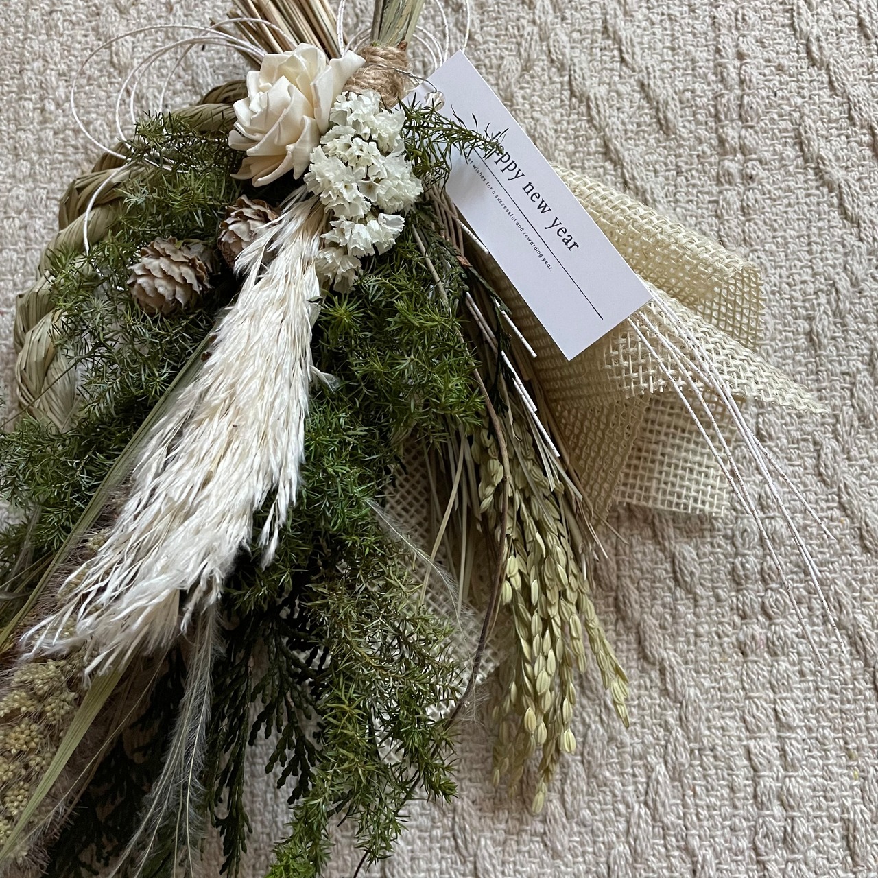 お花の部分がミニスワッグとして束ねており、取り外し可能となっているため、お正月が過ぎたあとはお部屋のインテリアとして飾っていただけます。